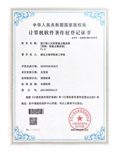 (科技处叶碧洲)近日,我校电子科学与信息工程系黄巧巧老师研发的《基于嵌入式的智能点餐系统[简称:智能点餐系统]V1.0》再获1项计算机软件著作权(登记号:2021SR0293412),这也是我校教师教科研研究成果的转化体现。