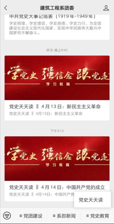 为此,建筑工程系分团委微信公众号从4月13日开始,正式推出“党史天天读”栏目,每日分享党史小知识,通过党的伟大成就来激励学生,通过党的优良传统来教育学生,通过党的成功经验来启迪学生,通过党的历史教训来警示学生。