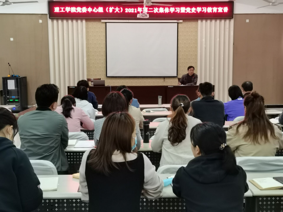 4月16日下午,学校在1教104报告厅召开党委中心组(扩大)2021年第二次集体学习暨党史学习教育宣讲会。学校全体党政领导、全体中层干部、各支部书记、全体辅导员、思政课老师参会。会议由院长助理贾娴雅主持。