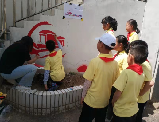 墙绘过程中,同学们极其认真,表现出专业的绘画水准,一刻也没有松懈。期间,小朋友们也参与进来,党员同学们引导小朋友们一笔一笔在墙上进行创作,给党史园地注入了阳光活力。
