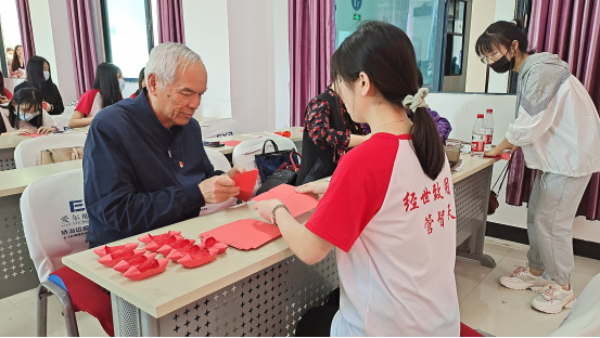 为表达对老党员最诚挚的感谢,学生亲手制作了庆祝建党100周年主题的剪纸、刺绣、书法作品赠与慕老先生。随后,慕先生与经管系学生共同合唱《唱支山歌给党听》,并与教师党员、学生代表共同折红船,献礼建党百年。最后,襄阳军休四所同志与经管系全体师生一起合唱《没有共产党就没有新中国》,喜迎党的百年华诞。