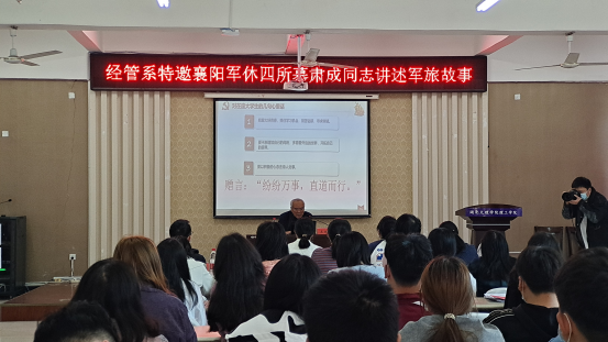 (经管系 徐凡)为深入了解老一辈革命者参与新中国建设的奋斗历程,5月18日下午,经管系党总支邀请到军休四所同志来校开展“军旅故事分享”的主题讲座,共庆建党百年。襄阳军休四所所长李晖同志、军休四所退休党员慕肃成同志出席会议。经管系全体教师党员和学生代表参与活动。
