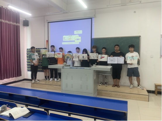 本学期以来,思政课教研室开展“以学生为中心”的教学试点改革,在传统讲授法基础上,大范围尝试探究式、讨论式、“翻转课堂”等新型教学模式,旨在让学生各展所长,成为课堂的主体。此种以兴趣为导向的教学模式,唤醒了大学生的自主学习意识,让传统的思政课接地气、冒热气、有生气。又如应电2021班第四小组的成员们,在高中时期基本都有书画的学习经历,于是在实践环节,他们用手绘图画的形式,向大家讲解了全面建成小康社会的知识点。