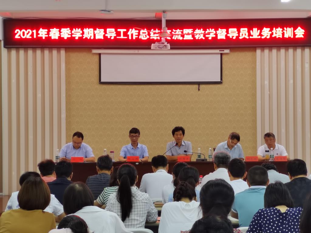 ( 教学质量评估中心 张慧玲)7月4日上午,教学质量评估中心在J1-104召开了2021年春季学期督导工作总结交流暨教学督导员业务培训会。常务副院长耿帮才,校聘转设顾问胡志超,转设办主任夏清华,教务处处长胡阳、副处长张翼、冯丹丹,全体校级督导专家,质评中心工作人员,各系主任与副主任、专业负责人、教研室主任,各系教学督导员参会。会议由教学质量评估中心主任张治国主持。