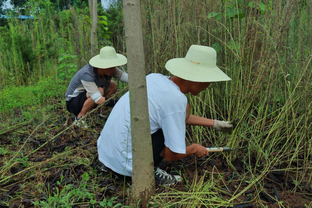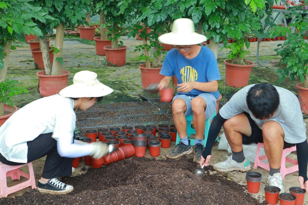 8月22日进行除草工作,大家划分好各自的区域来除草。然后在大棚内做好培土、上盆、浇水等任务,最后把花苗种到花盆里即任务完成。