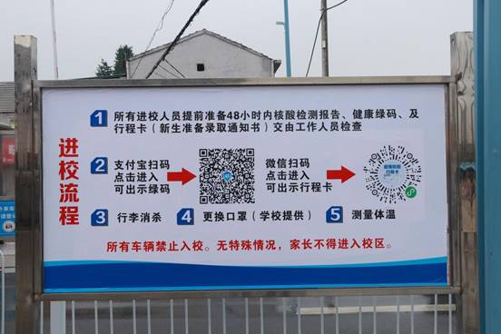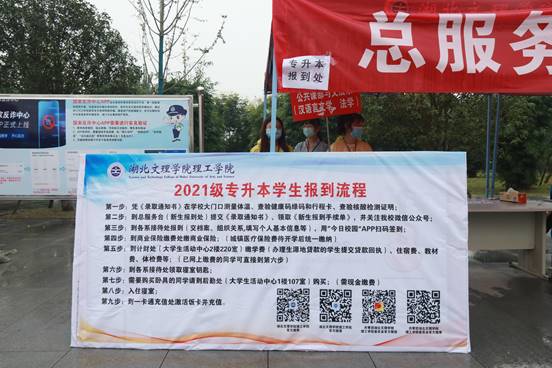 在学校大门口,放置了“进校流程”“2021级专升本学生报到流程”展板,学生严格按照流程进校。