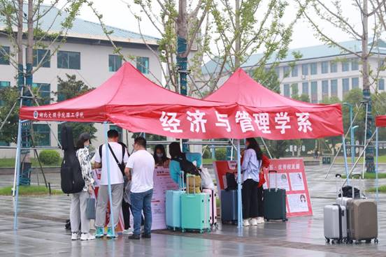 专升本新手到各自系服务台报到后,由志愿者帮助完成报到手续