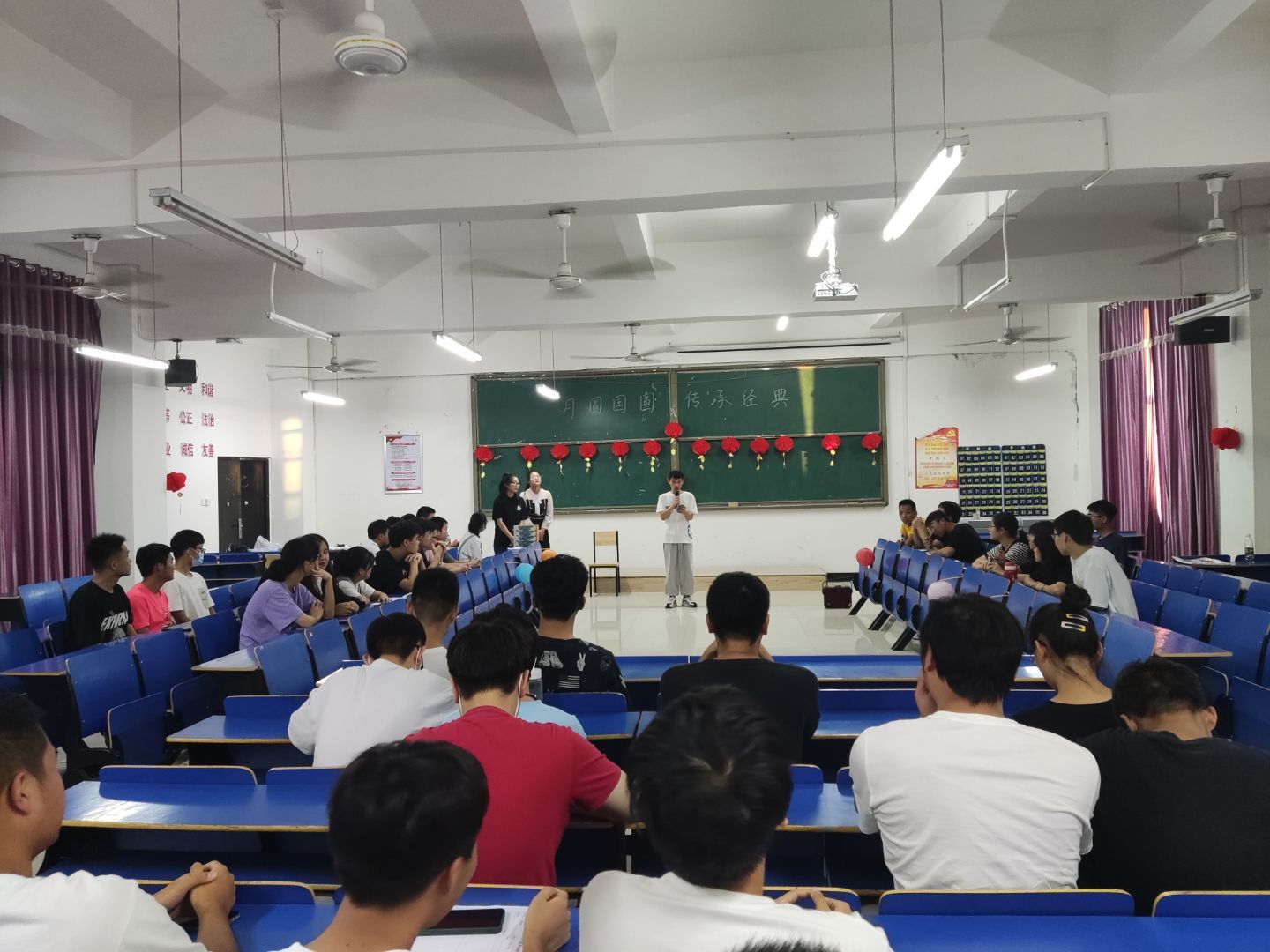教室里用大大小小的灯笼装点布置,五颜六色的灯谜为节日更添一份喜庆温馨。猜灯谜、诗词接龙、你划我猜、不能说的秘密四轮游戏轮番进行。活动的最后,全体同学在烛光中许下对亲人朋友美好的祝愿,遥寄深深的思念。