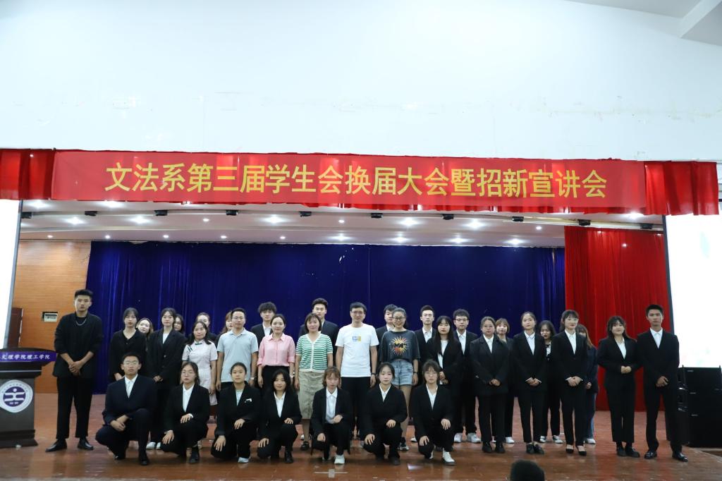 (文法系 郑怡雯)9月23日下午,公共课部与文法系在大学生活动中心举办了第三届学生会换届大会暨招新宣讲会。文法系党政领导出席会议。各系学生联合会主席、文法系第二届、第三届全体学生会干部和2021级新生参会。
