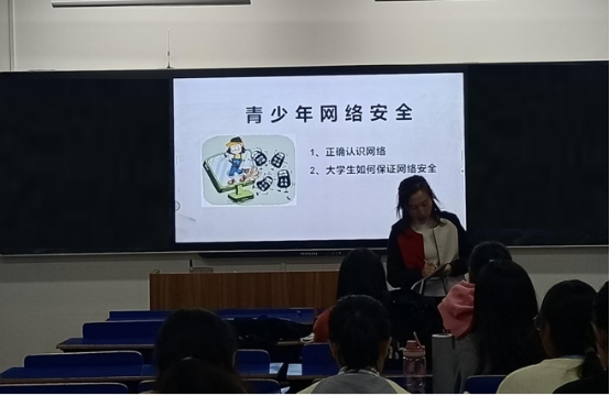 外语系大一辅导员付毅红通过宣传教育让学生了解并掌握网络安全和法律法规方面的相关知识。课后,通过让学生观看相关的视频,培养学生绿色上网、文明上网意识和良好习惯,增强师生网络安全防护能力,让学生更全面地了解网络知识,自觉维护国家、学校网络空间秩序。