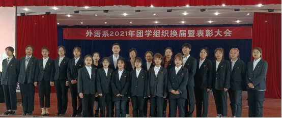 (外语系 王凯)10月15日中午,外语系在大学生活动中心三楼报告厅举行2021年团学组织换届暨表彰大会。外语系党政领导和辅导员出席大会,2020级、2021级全体学生参会。