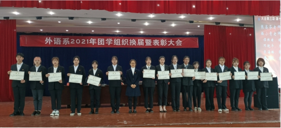 会上,举行了外语系第十九届团学组织换届仪式,对获得“优秀学生干部”、“迎新优秀工作者”、“暑期社会实践先进个人”的同学进行表彰。