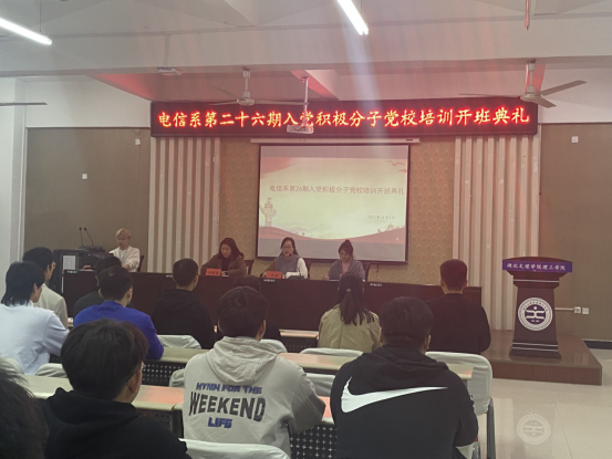 (电信系 彭亚岚)11月1日晚,电信系于一号教学楼104教室举行第26期党校培训开班典礼。电信系党总支副书记李颖,2020级辅导员刘圆鑫老师,党员代表及第26期党校学员出席会议。会议由党校班主任彭亚岚主持。