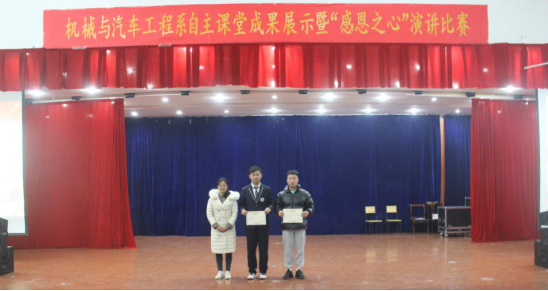 (机械系 孔德颖)为培养大学生的感恩意识,树立正确的人生观,12月4日晚,机械与汽车工程系在大学生活动中心三楼报告厅举办了自主课堂成果展示暨“感恩之心”演讲比赛。