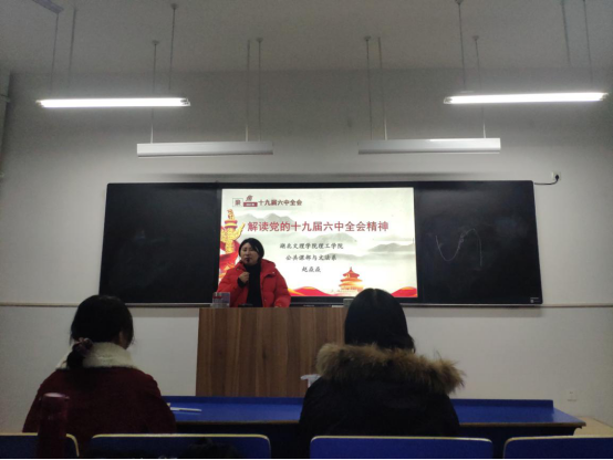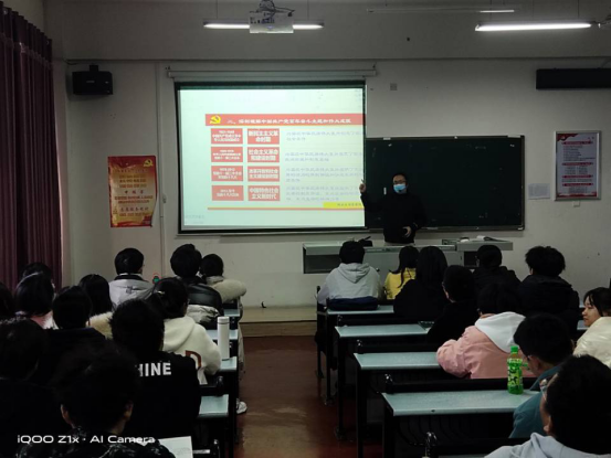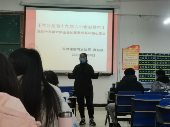 赵焱焱老师通过视频与讲解相结合的方式,对全会基本情况、召开背景、主要内容进行讲解,推动全会精神“进课堂”,引导大学生从百年党史中汲取奋斗力量,为实现中华民族伟大复兴中国梦奉献青春力量。
