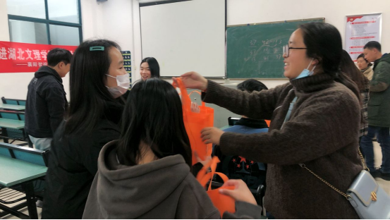 老师们在学生寝室和考研教室与考研学生进行了亲切交谈,了解学生的复习状况,并结合自己当年的考研经历和学生交流心得体会。最后给每个考研学子送上了寓意“金榜题名”的大礼包,包括毛巾(金)、棒棒糖(榜)、手提袋(题)、明信片(名),以及牛奶,寓意牛气冲天。其中,明信片上有老师们亲笔写的祝福语,手提袋特意选了橙色,寓意一举成功。学生们都表示深受感动,会更加努力积极备考,不辜负老师们的殷切希望和满满的心意。