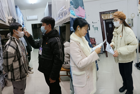 本活动外语系支部党员和学生会成员共同参与,他们以小组为单位进入学生宿舍进行日常测温、防疫宣讲、防火防诈骗宣传以及闲置物品收集。本次活动重点强调了疫情防控问题、宣传了各类安全知识、传递了不一样的温暖,同学们对此次志愿服务活动表示充分感谢。