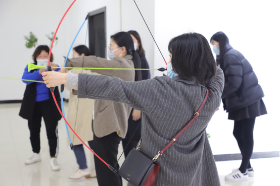 本次活动,40名学工人员分为8队,轮流在四个项目中进行比拼。冰壶和射箭项目因其新奇性,大受追捧。“踏平压力”则因要在指压板上用筷子和球拍运送乒乓球,让队员们连呼“痛并快乐着”。而“合力建塔”则是最安静的项目,大家屏气凝神,联手控制数十根细绳中央的三角形金属架,协调配合,轻蹲慢起,合力操控三角架勾住散落的积木,一块块叠在一起,垒放成塔。