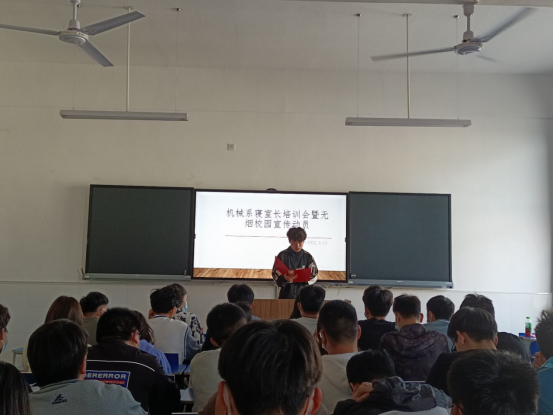 (机械系 朱未阳)为带领寝室长们更好地了解工作职责,创建寝室文化和无烟校园,机械与汽车工程系于4月13日下午在机械楼304教室举办寝室长培训会暨无烟校园宣传动员会。机械系分团委书记全春艳及各辅导员出席了大会。