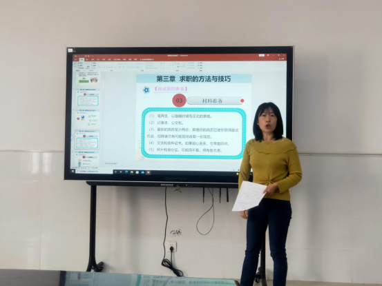 会上,王琳琳老师讲述了《掌握求职技巧预防求职陷阱》这一章节的内容,她通过小视频、PPT、讨论等多种形式开展教学,将在授课中的特殊设计、注意点、重难点等一一道来。