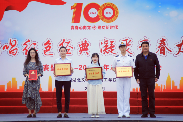 比赛间隙,校领导为获得2021-2022学年度“优秀共青团员”、青年大学习“学习标兵”、“优秀团学干部”、“优秀学生会”、“优秀团务工作者”、“五四红旗团支部”“五四红旗分团委”的先进单位和个人颁奖并合影留念。