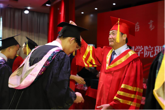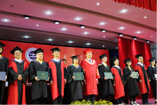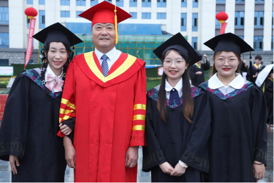 院长杨海浪率学校学士学位评定委员会成员为本科毕业生代表送上毕业祝福,把学士帽上的流苏从右边拨向左边,颁发学位证书并合影留念。
