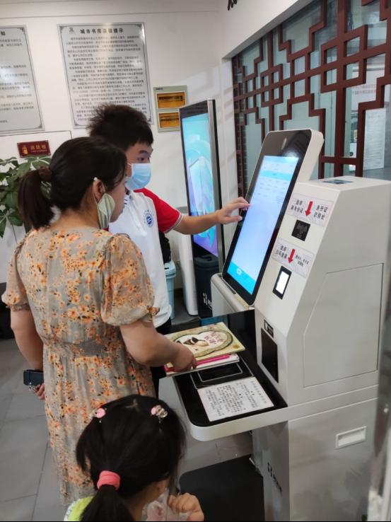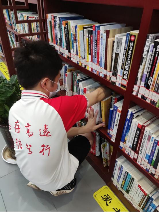 学生志愿者分成两人一组,每天前往昭明书房和营盘书房进行值守,有次序地将图书分类、整理、排架;协助读者用自助机完成借书、还书、找书,文明引导和防疫提醒等各项工作。