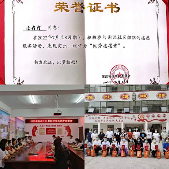 (公共课部与文法系 龚程)8月26日下午,高新区米庄镇谢洼社区在社区二楼会议室举行了2022年暑期优秀志愿者表彰会,我校文法系汪玲玲老师利用暑假休息时间主动下沉社区,积极投身谢洼社区组织的各项志愿服务活动,被评为“优秀志愿者”。