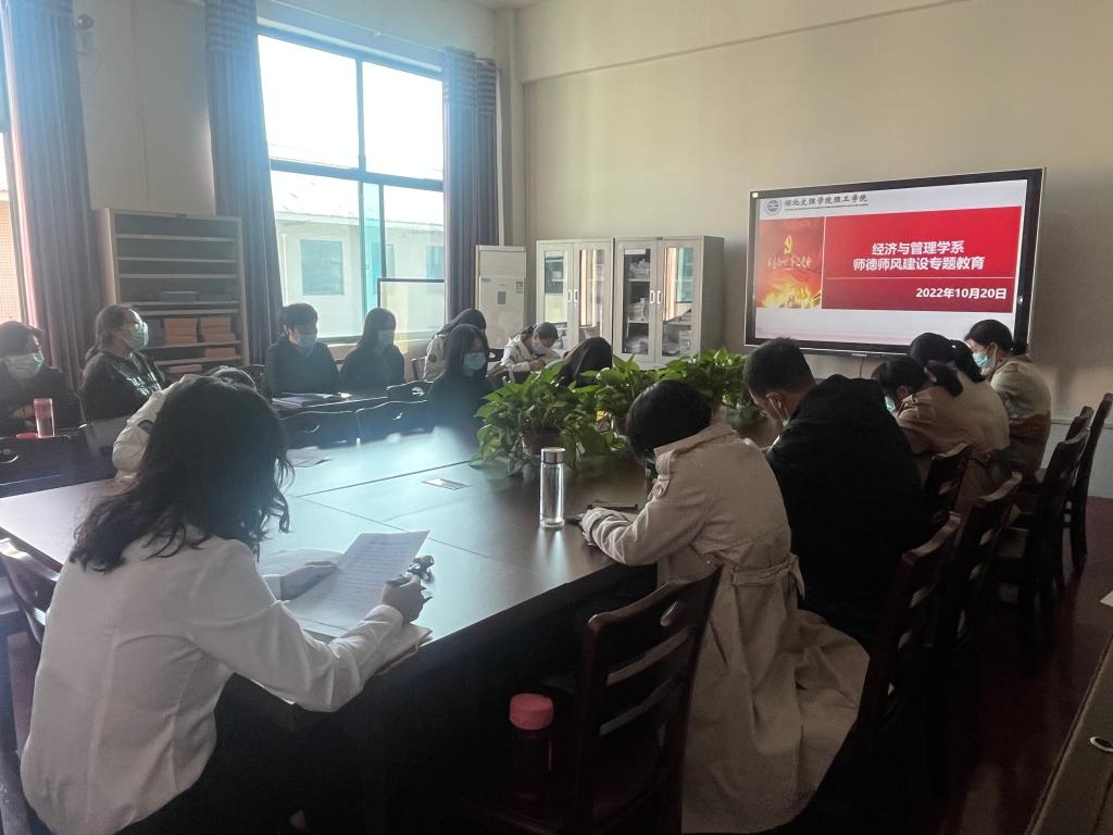 (经管系 周晓桥)为深入学习贯彻习近平总书记关于教育的重要论述和全国教育大会精神,加强师德师风建设,全面提升教师的综合素养,10月20日下午,经济与管理学系在4教309开展主题为“立德树人铸师魂,不忘初心正师风”师德师风建设专题教育。经管系全体教职工参会。