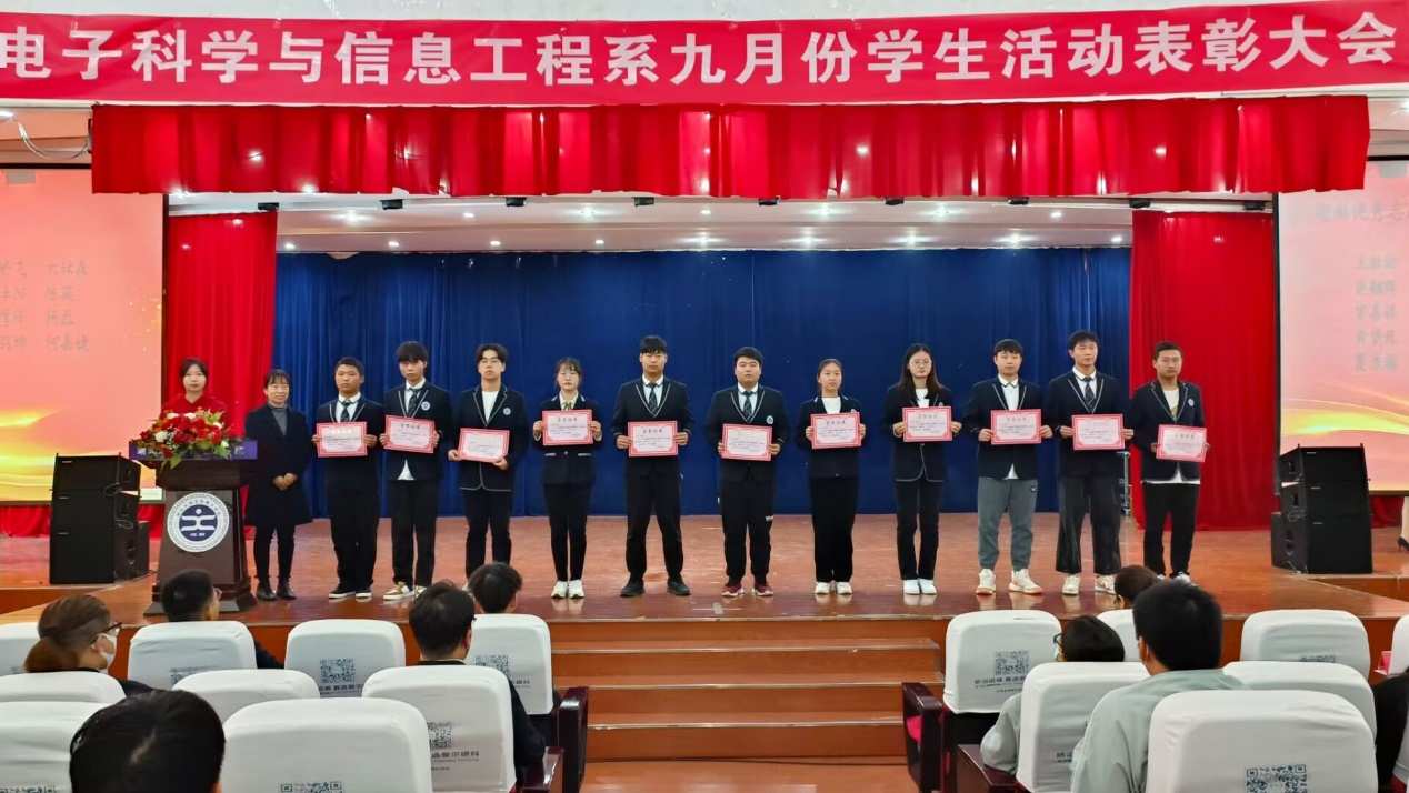 (电信系 田盼)为了促进校园文化建设,弘扬拼搏精神,加强电信系学生综合素质发展,10月28日,电子科学与信息工程系在大学生活动中心三楼报告厅举行9月学生活动表彰大会。