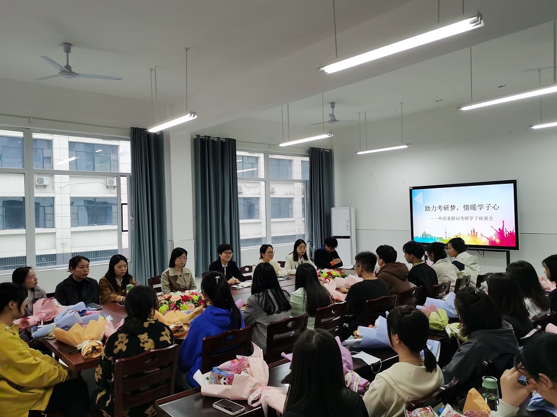 (外语系 张高芬)2023年全国硕士研究生考试在即,为增强学生考试信心,缓解备考压力,让学生以更加积极平和的心态迎接考试,11月3日下午,外语系开展“心系考研学子,‘研’途温暖陪伴”慰问座谈会。院长助理贾娴雅、外语系党政领导、专业负责人以及全体辅导员出席会议。他们为考研学子答疑解惑、排忧解难。