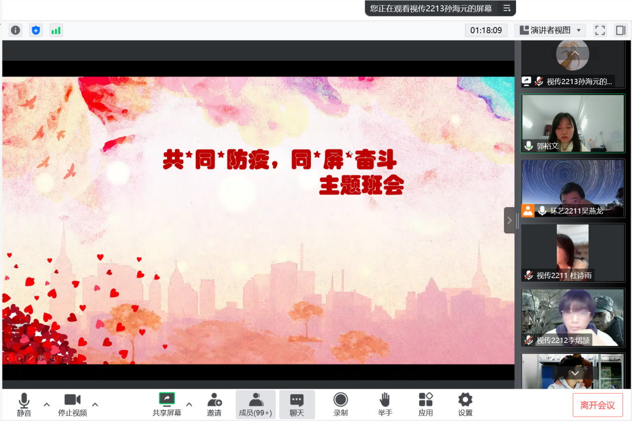 (艺传系 陈美霖 郭裕文)为提高学生疫情防控与寝室安全意识,11月24日晚,艺传系开展线上主题班会。会议对疫情防控及寝室安全教育提出要求。