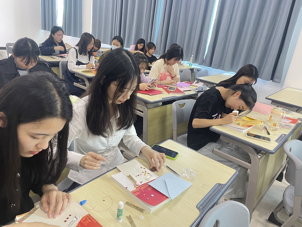 活动伊始,本次活动的承办寝室317宿舍给同学们播放了有关母亲的视频,学生们观看后深有感触,部分学生在观看后默默留下眼泪,感慨母亲的不容易和母爱的伟大。紧接着,全班同学玩起了击鼓传花游戏。在歌曲《Poker Face》充满节奏感的旋律中,接到道具花却没来得及传出去的同学分享自己和母亲的故事或者自己为母亲做过的事情。学生们在欢乐的游戏中分享温情的故事,快乐与感动并存。最后,学生们亲自为母亲做贺卡,写感谢语。袁老师提前给大家准备了做贺卡相关的手工材料,学生可以根据自己的想法自由发挥,为母亲做一份特别的礼物并且写上自己对母亲的感谢与祝福。
