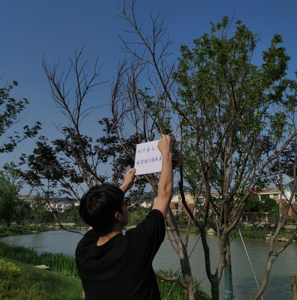 在襄水源生态公园,小组成员分工合作,开展环保践行和宣传活动。同学们同环卫工人一起进行环境清洁、垃圾分类等卫生环保工作,擦拭园区内公共设施,将公园卫生死角清理干净,为游人提供赏心悦目的游园环境;同时,同学们还在园区工作人员的指导下修剪树枝,并在树木上挂上以“保护树木”为主题的文明标语,提醒在此散步游玩的游客爱护植物,爱绿护绿,共创文明公园、文明城市。