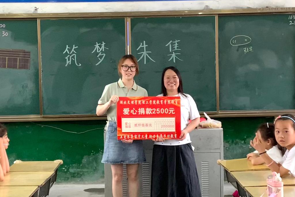 今年6月中旬,教育学院第五届学前教育专业作品展览中设立夏日市集,通过义卖手工艺品筹集2000元爱心款,教育学院晨曦志愿者服务队通过义卖筹集500元爱心款,共计2500元。在“三下乡”活动启动仪式上,指导老师陈曦向朱集乡村图书室捐赠了这笔筑梦资金,用于关爱朱集留守儿童,助力朱集乡村教育。