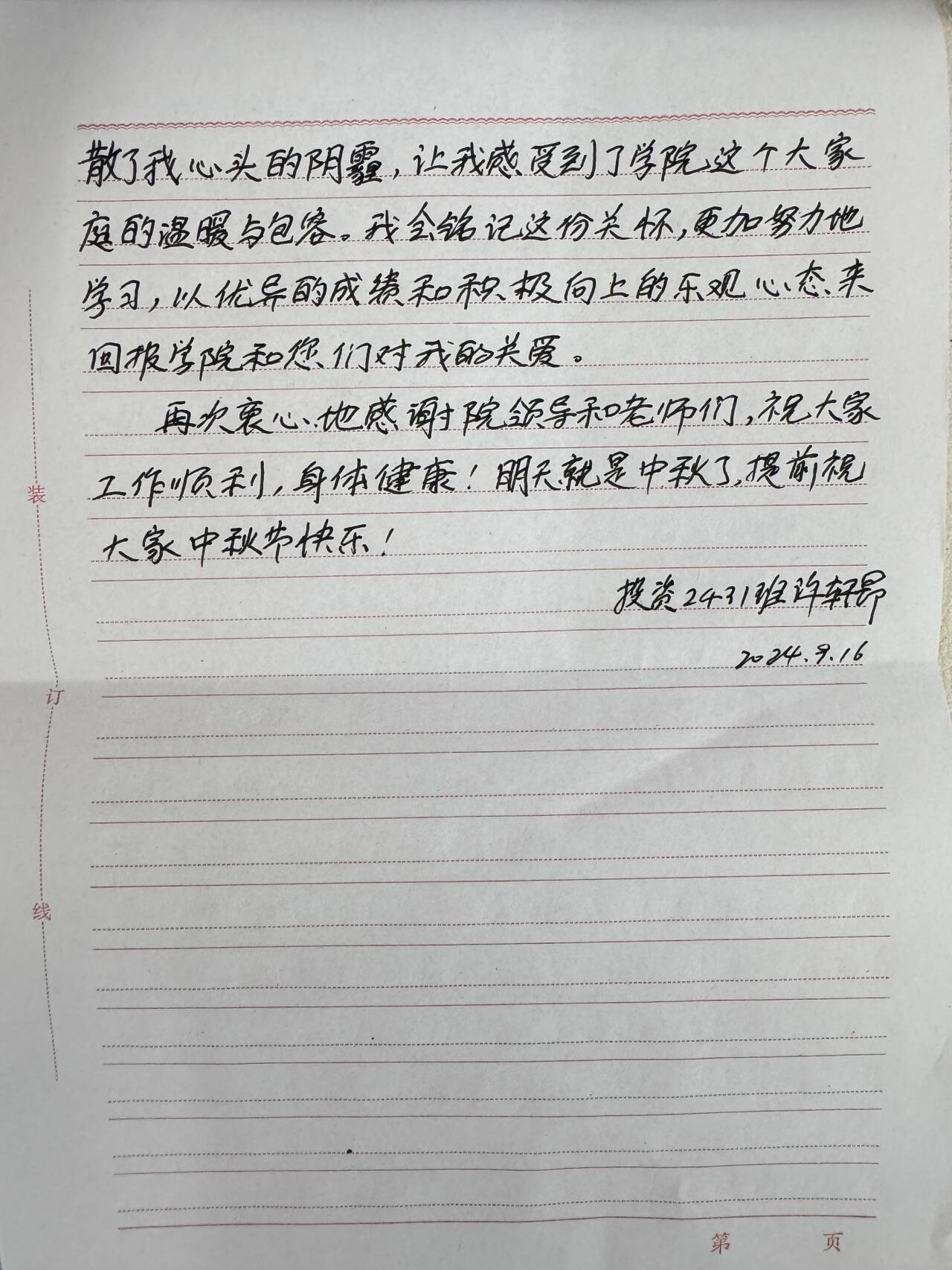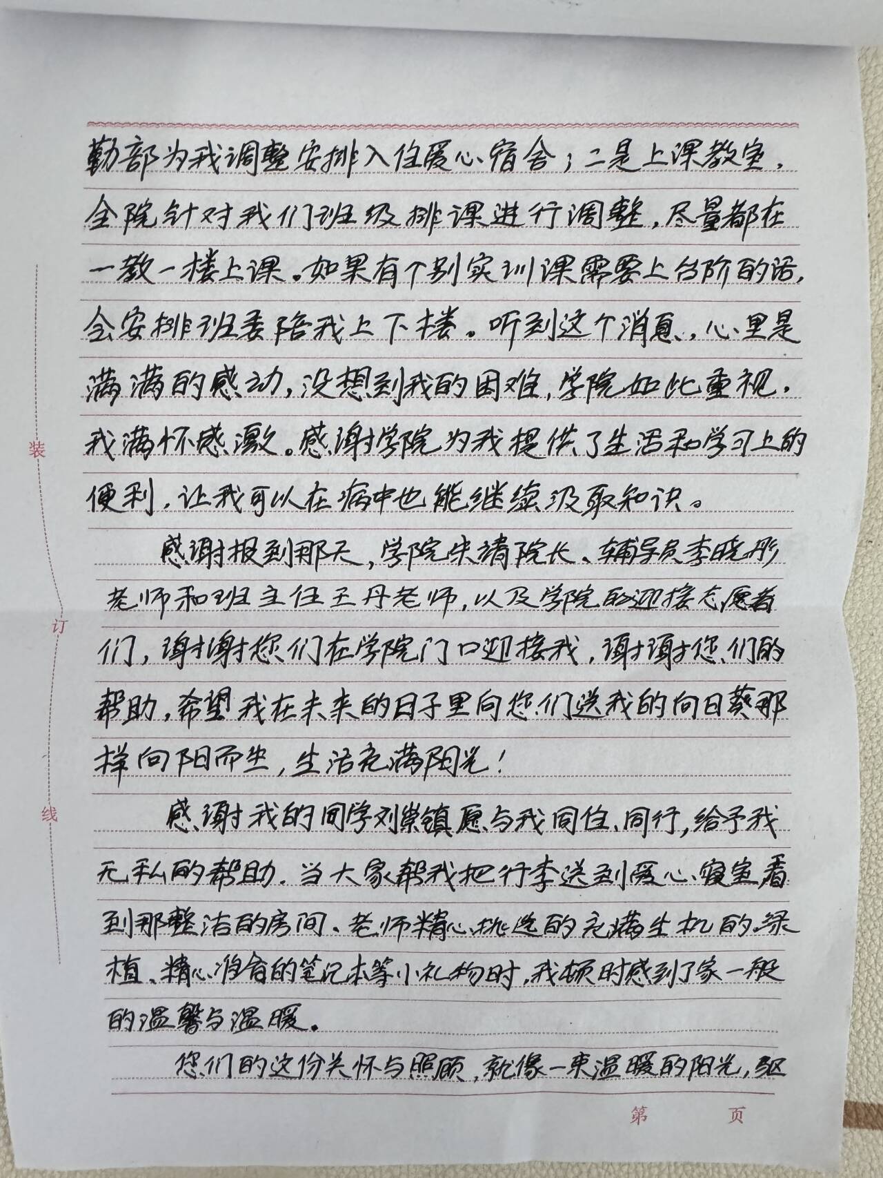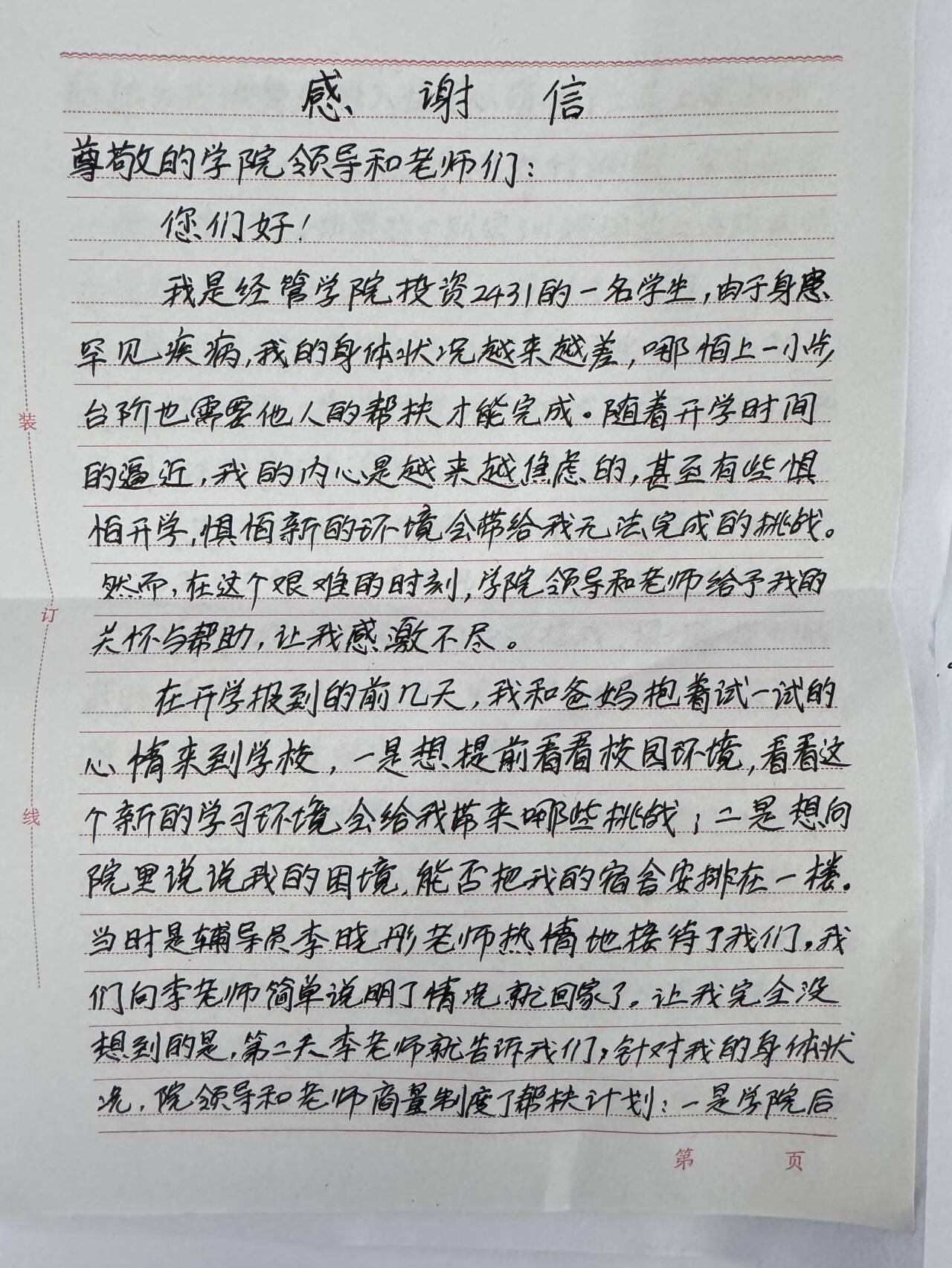 (经管学院 李晓彤)近日,经济与管理学院辅导员办公室收到一封来自2024级新生的手写感谢信。信件讲述了经济与管理学院关怀身患“庞贝病”新生,在校领导、学院领导和多个职能部门关怀下,提早制定“一对一”生活和学业帮扶,字里行间透露着对我校浓浓的感激之情。