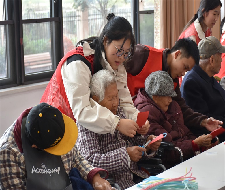 学生们在工作人员的带领下参观了小白象祥颐医养中心,陪伴老人聊天并为他们献唱《我和我的祖国》《强军战歌》等耳熟能详的经典老歌。随着室外温度逐渐变低,同学们把老人推进室内,进行了剪纸、扭扭棒DIY手工制作等活动,同学们与老人配合默契,一个个漂亮的剪纸从他们手中成型,老人们也在同学们的悉心引导下,编织出一个个花朵或爱心。