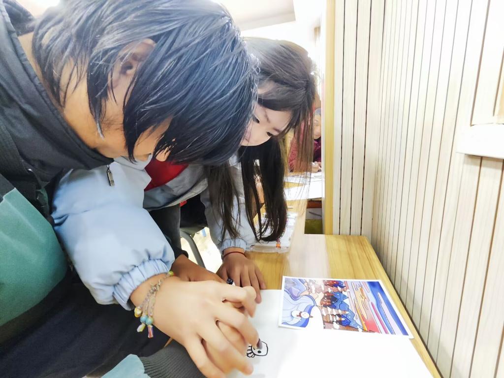 活动伊始,志愿者与孩子们齐唱《强军战歌》、《保卫黄河》等红色歌曲,一曲曲耳熟能详的歌曲表达了对祖国大好河山的眷恋、誓死捍卫美好家园的豪迈。随后志愿者讲述萧楚女、余益庵等人事迹,引导大家珍惜来之不易的和平,勿忘先辈牺牲。最后志愿者与孩子们共绘一幅画,通过手中的画笔描绘当下生活的精彩瞬间和对未来生活的幸福愿景,画卷的空白位置则附满了新一年的美好梦想。