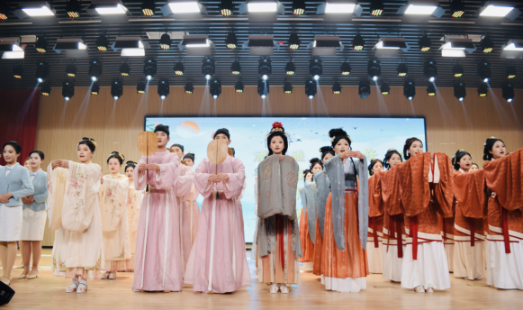 在《盼春》篇章中,歌曲《我乘着风飞过来》仿佛带着观众的思绪飞扬起来触摸到了春天的翅膀;教育学院任一帆老师带来的独舞《敕勒川》用灵动舞姿勾勒出我们心中对春的盼望;歌曲《等你下课》唱出了情愫少年的青春故事;礼仪舞蹈《礼耀中华》呈现了中华礼仪之美。