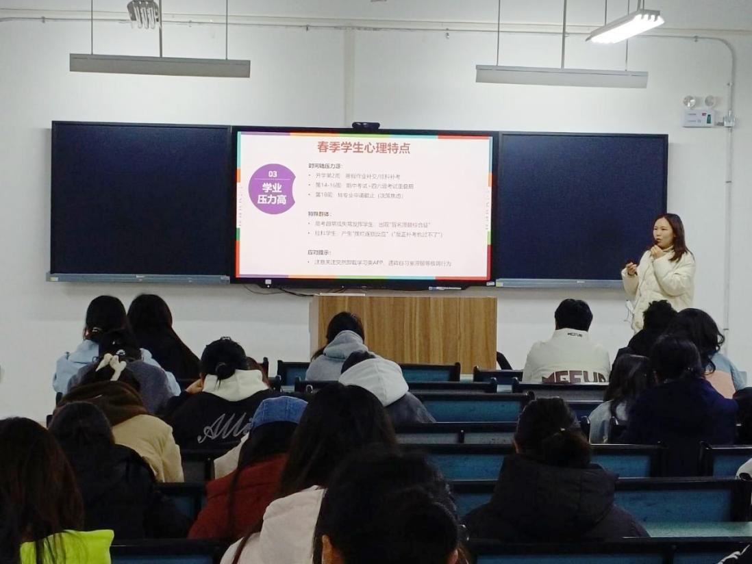 (学生工作部 鄢雪琪 殷逸茹)为充分发挥班级心理委员的“心灵哨兵”作用,提升春季学生心理问题识别与朋辈支持能力,2月25日晚,我校心理健康教育中心在一教407举办“春季护航心灵成长”专题培训。2024级全体心理委员参与活动,心理健康教育中心专职教师鄢雪琪担任主讲人。