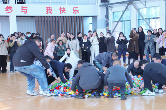活动中,首先开始的“爱拼才会赢”活动便瞬间点燃现场气氛,男教职工纷纷化身“护花使者”,为各小组的女同事抱取物资,既有“大力士”疾跑,也有“智多星”守住阵地,展现了我校男女教职工团结协作的温馨画面。