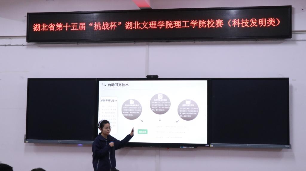 (通讯员 杨丽华)3月13日,学校在1教105报告厅举行湖北省第十五届“挑战杯”大学生课外学术科技作品竞赛校级选拔赛。本次比赛分设科技发明类与调查报告类两个专场同步进行,共收到73项参赛作品,其中科技发明类34组、调查报告类39组。