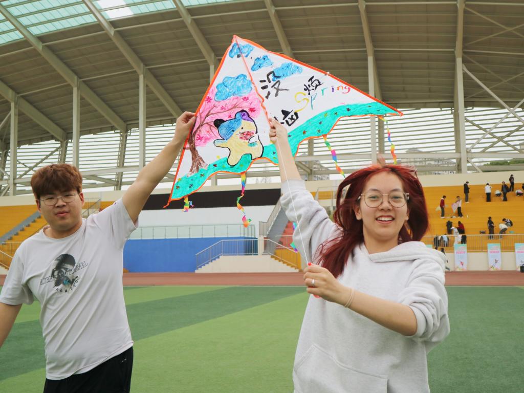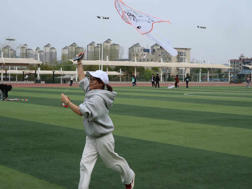 师生们完成绘制后,手持风筝奔跑在春风中,追风逐梦,让烦恼随风而逝。随着丝线轻放,承载着心愿与祝福的纸鸢翩然升空。田径场上空逐渐被五彩风筝点缀,师生们在协作与竞赛中拉近距离,欢声笑语不断。