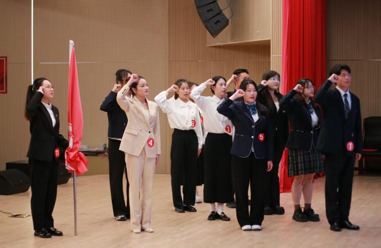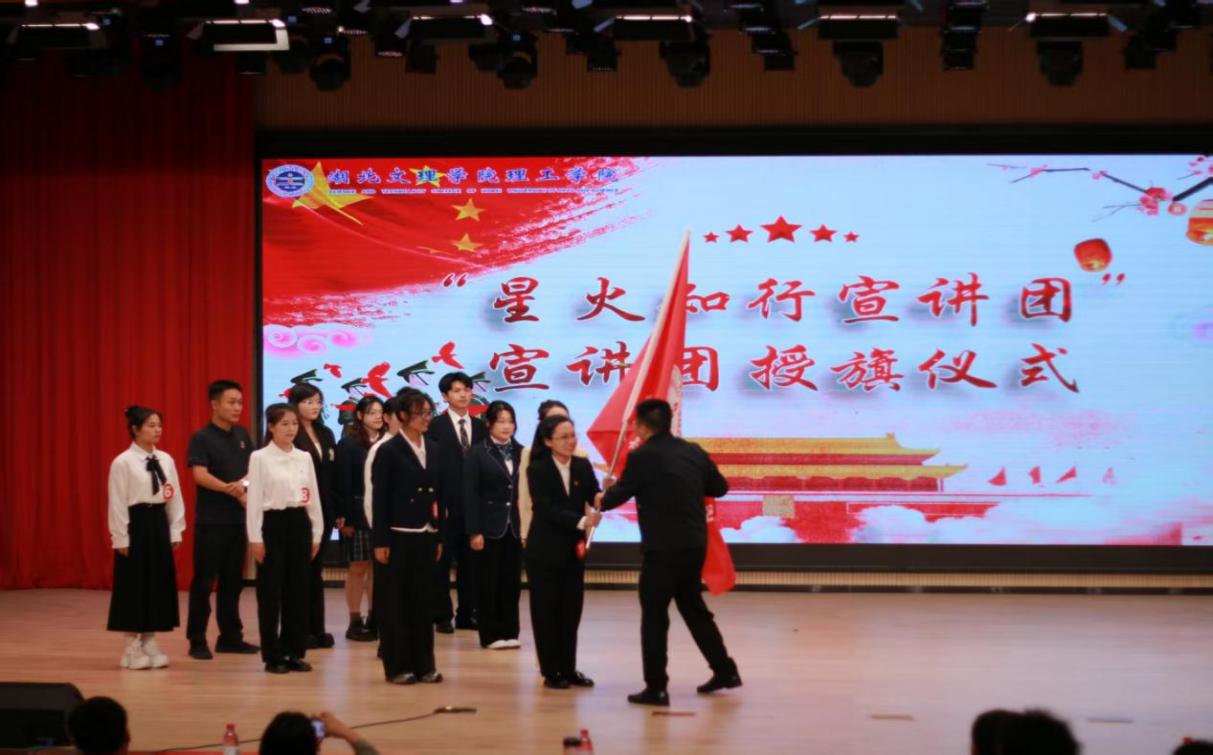 随后,宋功成为“星火知行宣讲团”授旗,标志着这支以传承红色基因为使命的青年宣讲队伍正式启航。授旗仪式后,全体宣讲团成员面向团旗庄严宣誓:“以信仰铸魂,以实践砺行,传承红色基因,讲好中国故事,争做新时代红色精神的坚定传播者”。铿锵有力的誓言响彻会场,展现出团员们赓续红色血脉、勇担时代使命的坚定决心。