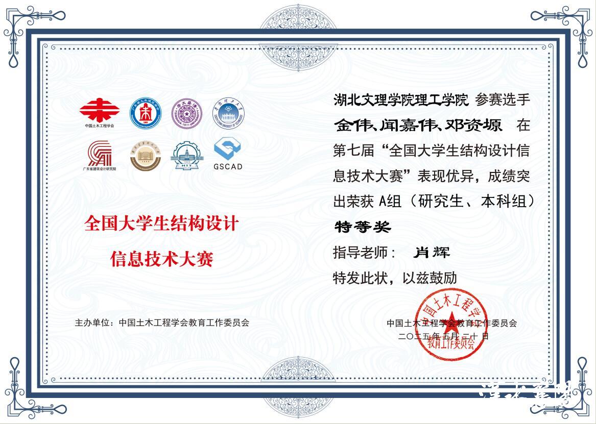 (建工学院 肖辉)在刚刚结束的第七届全国大学生结构设计信息技术大赛中,我校建工学子以扎实的专业功底与卓越的创新实践能力,在全国高校竞技舞台上勇创佳绩。荣获全国特等奖1项,全国三等奖3项,特别是特等奖需通过线上答辩直面专家评审,为赛事最高荣誉。本次比赛我校共有4组队伍参赛,所有参赛队伍全部获奖,刷新历史最好成绩!