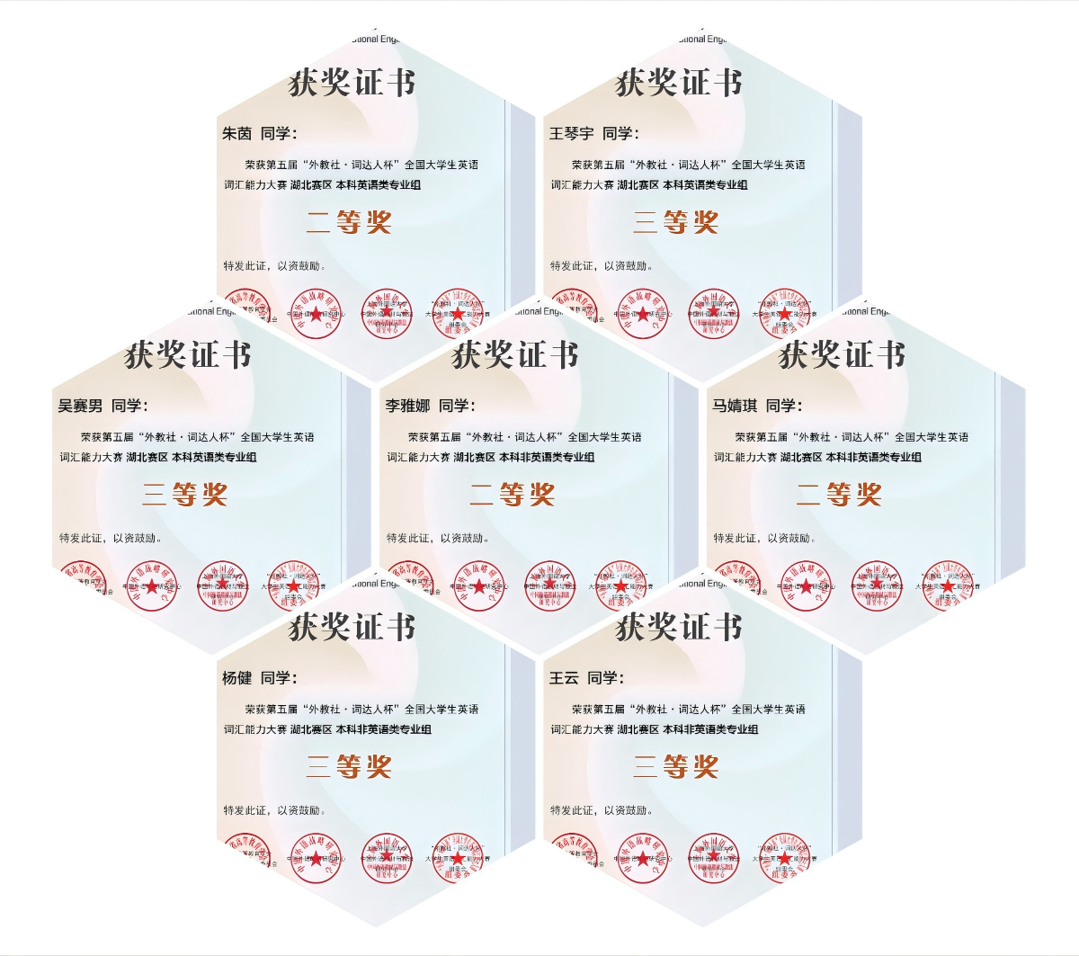 (教育学院 黄丹)近日,第五届“外教社·词达人杯” 全国大学生英语词汇能力大赛省级赛成绩揭晓,我校7名学生凭借扎实的英语词汇功底和出色的临场发挥,在众多参赛选手中脱颖而出,一举斩获省级二等奖3项、三等奖4项,为学校赢得了荣誉。