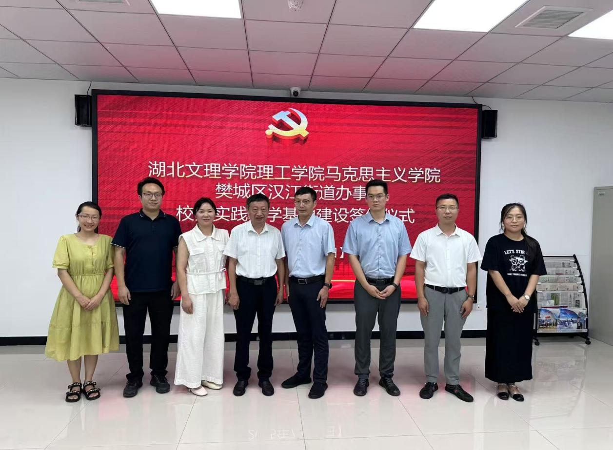 (马克思主义学院 倪鑫杰)7月18日上午,我校马克思主义学院与樊城区汉江街道办事处校外实践教学基地建设签约仪式在汉江街道办事处会议室举行。汉江街道党工委书记万银峰,汉江街道党工委副书记、办事处主任郭旺,汉江街道党工委委员、组织委员、办事处副主任郭文华,汉江街道党建工作办公室主任邓新月,我校马克思主义学院院长刘慧,副院长李明翔,沈年耀教授出席仪式。