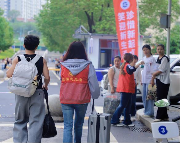 无论是烈日下,还是风雨中,等待你们的学长学姐们热心地引导你们,帮你们提行李……这是他们对志愿精神的传承,学长学姐将爱与温暖带给你们,希望你们也能延续这份爱与温暖。