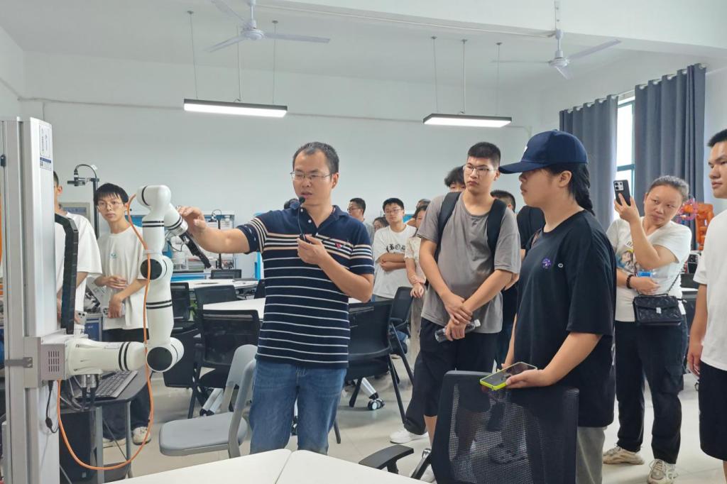 随后,黄能会还带领家长们走进互换性与工程材料实验室、液压实训室、机械原理实训室、PLC实训室、机械设计实训室、电工电子实验室、工业机器人实验室。他结合每间实训室的实际功能、所承担的学科竞赛方向、技能培养类型等详细地进行了讲解,并就各实验实训室的核心器械,进行了现场实操,直观讲解实训教学与技能培养的关联。