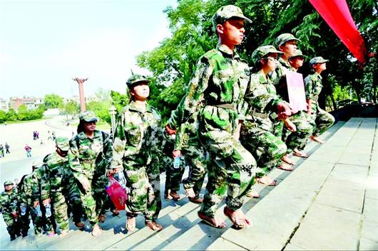 当天下午两点半,在岘山文化广场革命烈士纪念塔入口处,随着“前进”的口令声响起,在红旗和党旗的带领下,身着迷彩服、脚踏草鞋的学生们排成四路纵队,向岘山山顶迈进。